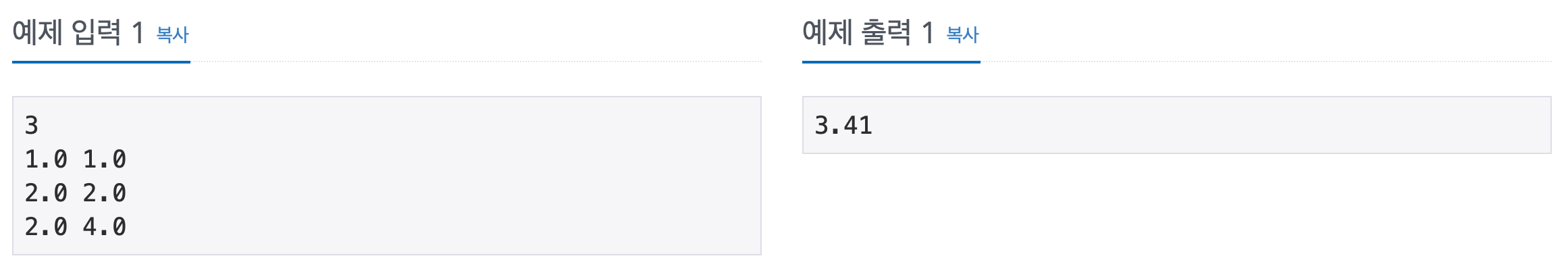 둘째 줄부터 n개의 줄에 걸쳐 각 별의 x, y좌표가 실수 형태로 주어지며, 최대 소수점 둘째자리까지 주어진다. 좌표는 1000을 넘지 않는 양의 실수이다.