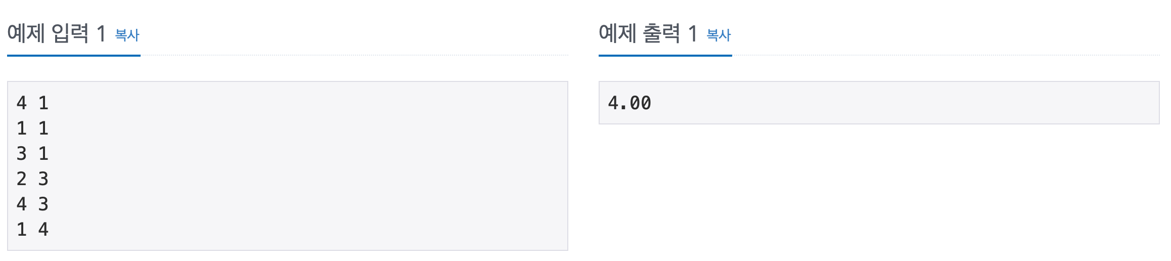 첫째 줄에 만들어야 할 최소의 통로 길이를 출력하라. 출력은 소수점 둘째짜리까지 출력하여라.