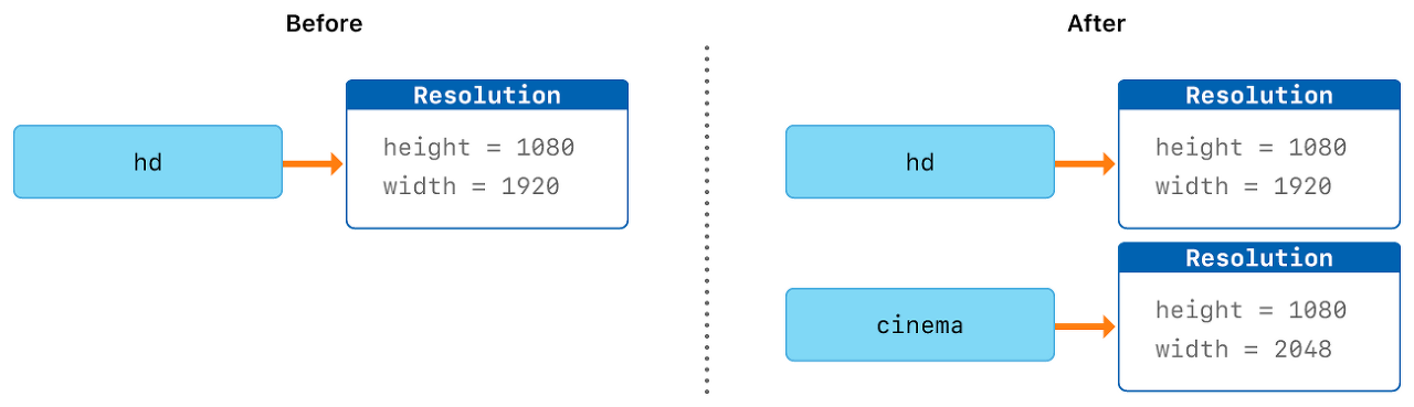위에서 선언한 Resolution 구조체의 인스턴스로 hd를 선언한다. 하나의 변수 cinema를 선언해서 hd 인스턴스를 할당한다. 그런 뒤 cinema의 width 프로퍼티를 수정한다. 어떤 변화가 있을까?