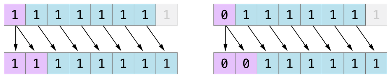양수와 음수가 저장되는 특별한 방식 때문에 둘 중 하나를 오른쪽으로 이동하면 0에 가까워 지게 된다. 이동하는 동안 부호 비트를 동일하게 유지하는 것이 값이 0에 가까워질 때 음의 정수가 음수로 유지되는 것을 의미한다.