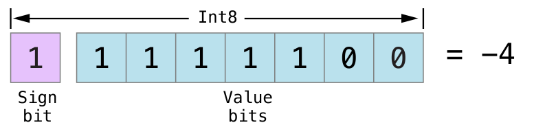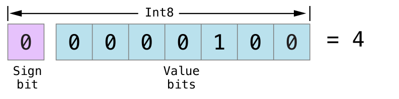 위의 예는 Int8 내부의 비트로 4라는 숫자를 찾는 방법이다. 첫 번째 비트, 즉 부호 비트가 0이기 때문에 이는 양수를 나타내는 비트이다. 그 뒤의 7개의 값 비트는 이진 표기법으로 작성된 숫자 4이다.