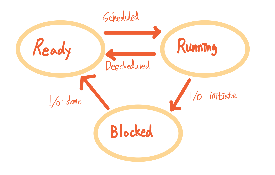 그럼 2개의 가정 중 하나인 "모든 작업은 CPU에서만 작동되며 I/O를 수행하지 않는다"를 먼저 없애 보겠습니다. 스케줄러는 어떤 작업이 I/O 요청을 시작할 때 결정을 내릴 수 있습니다. I/O 작업은 CPU를 사용하지 않기 때문입니다. 즉 I/O 작업이 수행되는 동안에는 CPU를 차단해야 합니다. 이렇게 I/O를 수행 중일 때 CPU를 차단하는 방식을 Busy Waiting 방법이라고 합니다. 예를 들어 하드디스크에 어떤 데이터를 저장하려고 할 때 데이터의 크기가 커서 오래 걸리게 된다면 CPU가 오랜 시간 일을 하지 않는 상태가 될 수 있습니다. 따라서 I/O 작업이 수행되는 동안 CPU에서는 다른 작업을 수행해야 합니다. 이렇게 I/O 작업이 수행되는 동안 CPU가 다른 작업을 수행하도록 하는 것을 Blocked라고 합니다. 스케줄러는 I/O가 완료되는 시기도 결정해야 합니다. 이 경우 인터럽트가 발생하고 I/O를 발생시킨 작업은 다시 Ready 상태로 돌아가야 합니다. 이렇게 I/O가 발생할 때 처리해야 하는 부분을 OS는 어떻게 처리할 수 있을까요?