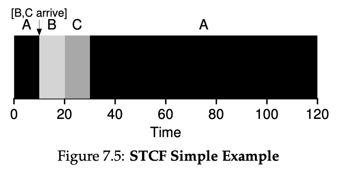 그럼 이제 선점 스케줄러인 STCF를 살펴보겠습니다. 아까 SJF에서 문제가 발생했던 예를 그대로 가지고 와서 STCF로 실행시켜보겠습니다. 우선 아까의 예는 100초가 걸리는 A는 0초에 도착하고 10초가 걸리는 B, C는 10초에 도착했었습니다. 하지만 비선점 스케줄러인 SJF에서는 B, C가 도착한 10초 시점에 A를 작동하고 있었기 때문에 A보다 더 일찍 끝낼 수 있는 B,C가 A가 끝나기를 기다려야만 했습니다. 아래의 그림은 STCF로 동일한 예를 동작시킨 결과입니다.