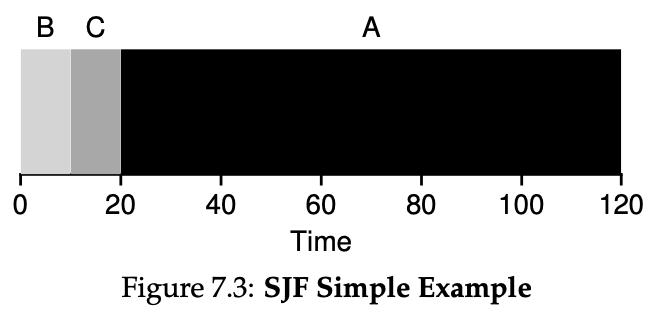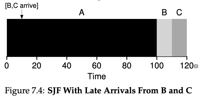 어떤가요? 아까 FIFO로 동일한 작업을 수행했을 때(Turnaround Time의 평균은 110초, Response Time의 평균은 70초)와 비교하면 훨씬 좋아지지 않았나요? Turnaround Time의 평균이 줄어들게 된 것을 볼 수 있습니다. 이렇게 SJF는 항상 가장 짧은 프로세스를 먼저 실행하기 때문에 항상 최적의 Turnaround TIme을 가져다줄 수 있습니다. 하지만 단점은 이를 바로 없애 버릴 정도로 큽니다. 이 단점을 이해하기 위해서는 아까 정의한 가정중 하나인 "모든 작업은 동일한 시간에 도착한다"를 없애야 합니다. 그럼 이를 없앤 예를 보며 단점을 이해해보겠습니다.