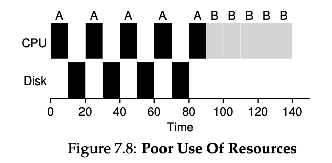 위의 예에서는 A, B 두 개의 작업이 존재합니다. A 작업과 B 작업은 모두 50초의 수행 시간을 가지고 있습니다. 그리고 A 작업은 10초마다 I/O를 발생시킵니다. 여기서 발생하는 I/O는 모두 10초씩 걸린다고 가정하겠습니다. 이때 만약 스케줄러가 I/O가 발생하는 동안 A 작업이 계속 CPU를 차지하고 있고 다른 작업이 접근하는 것을 차단한다면 위의 그림과 같은 결과가 발생합니다. 이러한 방법을 Busy Waiting 방법이라고 합니다. 이는 CPU가 I/O 작업을 수행하는 동안 놀게 되는 문제가 발생합니다.