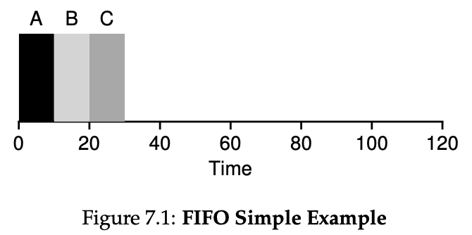 위의 그림에는 A, B, C 프로세스가 있습니다. 이들은 모두 0초에 도착했고 완료되는데 필요한 시간은 모두 10초입니다. 도착한 시간이 동일하다면 알파벳순으로 실행한다는 규칙도 있다고 가정할 때 FIFO 스케줄링 기법을 사용해서 프로세스를 수행하면 위와 같은 시간 그래프가 나타나게 됩니다. 그럼 여기서 Turnaround Time과 Response Time을 한 번 구해볼까요?