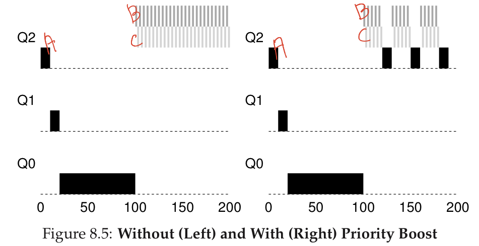 위의 그림에서 왼쪽이 priority boost를 적용하지 않은 상황이고 오른쪽이 50초마다 prioirty boost를 적용한 상황입니다. 왼쪽 그림에서는 아까 말한 문제대로 A 작업이 100초부터 실행되지 않는 것을 볼 수 있습니다. 이와 반대로 priority boost를 적용한 오른쪽에서는 50초마다 모든 작업의 우선순위를 우선순위가 가장 높은 큐인 Q2로 이동시키며 A도 수행할 수 있도록 만들어주는 것을 볼 수 있습니다. 여기서 몇 초마다 boost를 해줄 것인가에 대한 의문이 생기지 않나요? 너무 길게 설정하면 기아 상태의 지속시간이 비교적 짧아질 뿐이고 너무 짧게 설정하면 대화형 작업이 CPU 시간을 제대로 할당받지 못할 수 있습니다.
