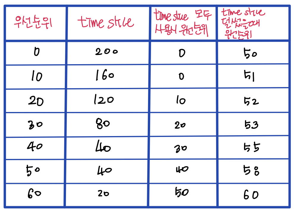 - 규칙 4 : 작업은 모든 우선순위에서 주어진 time slice를 모두 사용하면 우선순위가 감소한다.