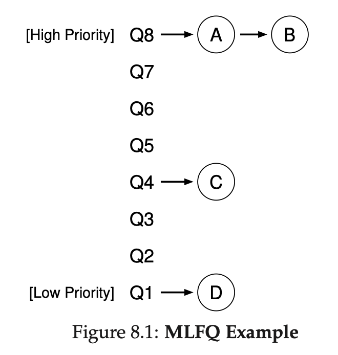 위의 그림을 보면 Q8에 A, B 프로세스, Q4에 C 프로세스, Q1에 D 프로세스가 존재합니다. MLFQ는 우선순위에 따라 스케줄링한다고 했으니 A, B가 가장 먼저 RR방식으로 수행될겁니다. 그렇다는 것은 A, B가 완료 될 때 까지는 C, D는 스케줄링이 되지 않는다는 말입니다. 만약 A,B가 아주 오래 걸리는 작업이라면 C, D의 Response Time은 급격히 나빠질거에요. 저희가 MLFQ를 사용하는 이유가 사라지는 것이죠. 그럼 이런 문제를 해결하기 위해 우선순위를 상황에 따라 변경해줘야 하는데 어떻게 변경해줘야할지 다음 섹션에서 알아보겠습니다.