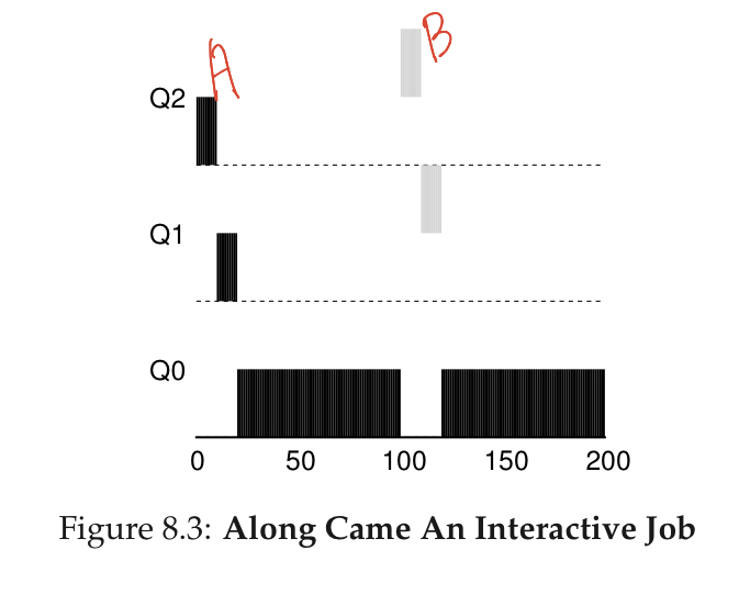 위의 예를 보게 되면 Q0, Q1, Q2의 time slice가 모두 다른 것을 볼 수 있습니다. 우선순위가 낮다는 말은 CPU를 주로 사용한다는 말이고 실행시간이 긴 작업들이 이에 속합니다. 따라서 time slice가 큰 것이 더 잘 작동할 수 있습니다. 이는 Context Switch와도 관계가 있습니다. Context Switch에도 비용이 발생하기 때문에 우선순위가 낮은 작업에서는 이를 최소화 하는것이 더 효율적일 수 있기 때문입니다. 반면에 우선 순위가 높은 작업은 주로 I/O를 사용하는 대화형 작업이며 짧은 time slice를 적용하여 빠르게 다음 작업을 수행하는 것이 좋습니다.