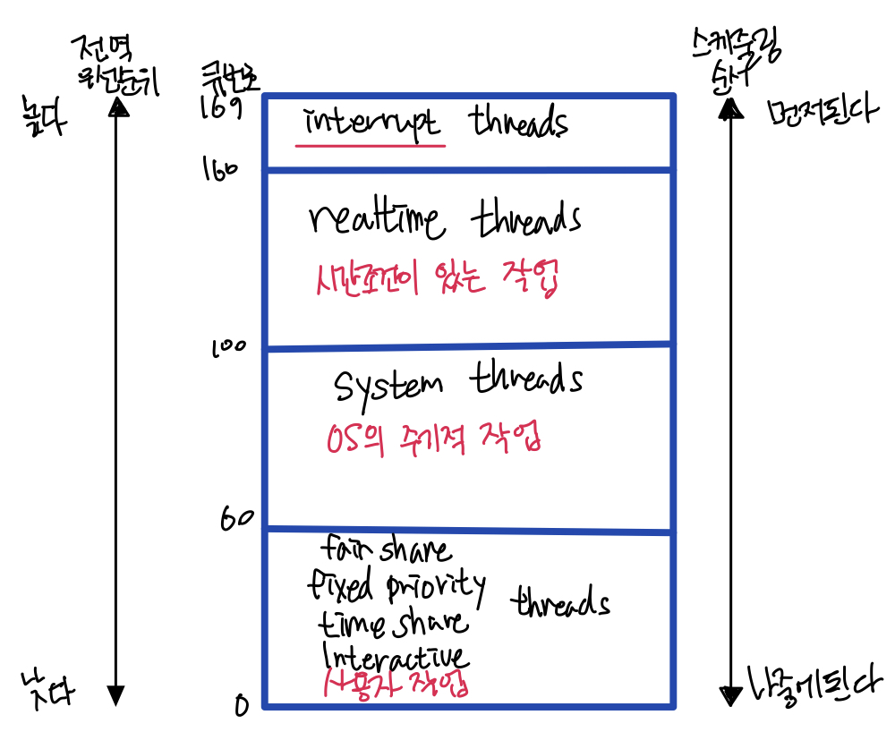 위의 그림에서 보면 큐 개수가 170개인 것을 볼 수 있습니다. 또한 각각의 우선순위에 접근할 수 있는 작업들의 종류를 구분해놓은 것을 볼 수 있습니다. 여기서 사용자 작업에 사용되는 큐들인 0~60번 큐 까지는 어떻게 우선순위를 설정하는지도 살펴보겠습니다.