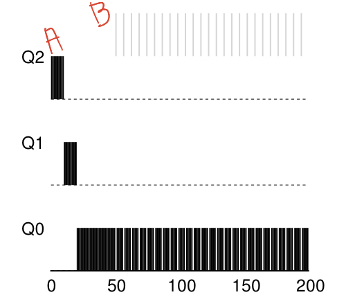 위의 그림의 예는 아까보다는 좀 더 복잡하게 작업이 2개가 존재합니다. 편의상 A, B라고 제가 이름을 붙였습니다. 아까와 time slice는 10초로 동일하고 새로 들어오는 B 작업은 20초가 걸리는 작업이라고 가정하겠습니다. A 작업은 100초까지는 아까와 동일하게 동작합니다. 그런데 100초에서 B작업이 새로 들어오게 되고 규칙 3에 의해 새로운 작업은 가장 높은 우선순위를 가지게 됩니다. 따라서 A를 중단하고 B를 수행하게 됩니다. B작업이 time slice 2번만큼 동작하는 짧은 작업이었기 때문에 Q1에서 완료하게 됩니다. 이렇게 B작업이 위의 그림처럼 비교적 짧은 작업이라 빨리 끝나게 된다면 SJF와 비슷하게 동작하게 됩니다. 반면에 B작업이 많이 오래 걸리는 작업이었다면 결국 Q0까지 내려와서 A, B는 RR로 작동하게 될 것입니다. 그럼 이번에는 I/O 작업이 있는 예를 보겠습니다.