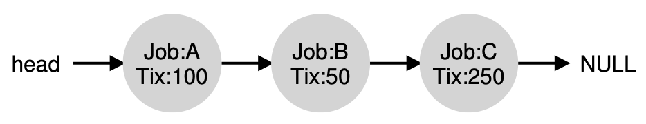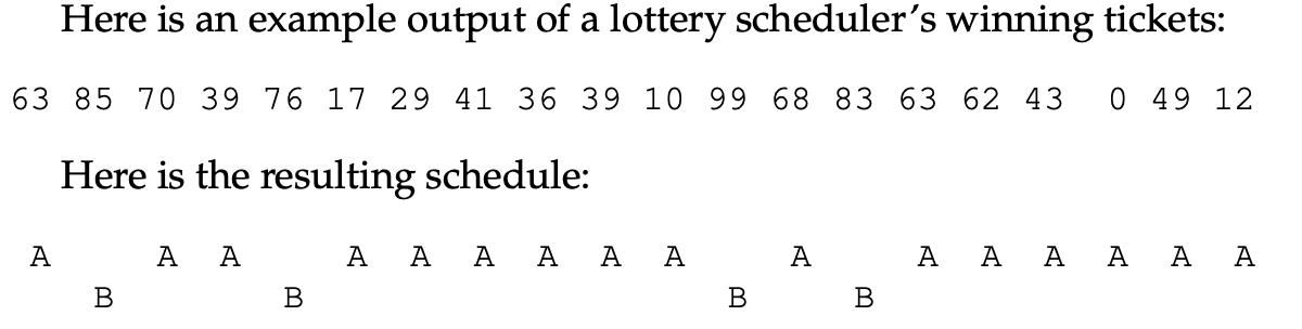 Lottery 스케줄링 방법의 가장 좋은 점은 간단하다는 것입니다. 지금까지 함께 알아봤는데 이를 만들기 위해서는 뭐가 필요할까요? 무작위로 티켓을 뽑는 것, 프로세스 목록을 가진 자료구조, 그리고 총 티켓수만 있다면 이를 구현할 수 있습니다. 예를 한 번 보겠습니다.