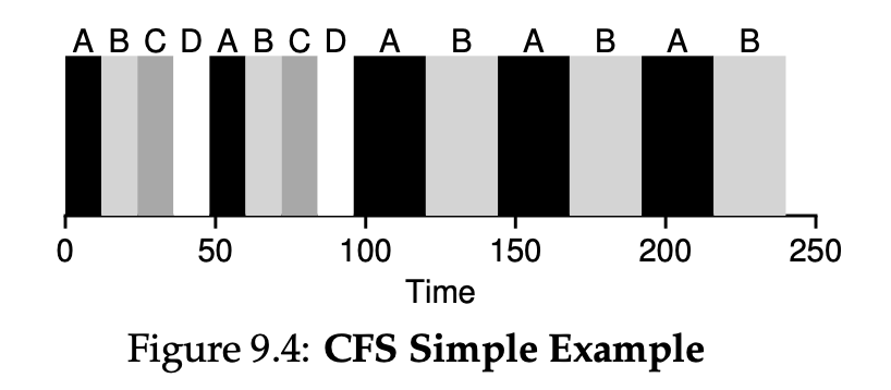 지금까지 proportional share 스케줄링의 방법을 열심히 알아봤지만 Linux에서는 알아본 방식과는 다른 방식으로 fairness를 만족시킵니다. 바로 CFS(Completely Fair Scheduler)라는 이름의 스케줄링입니다. 이번 섹션에서는 CFS에 대해 알아보겠습니다!