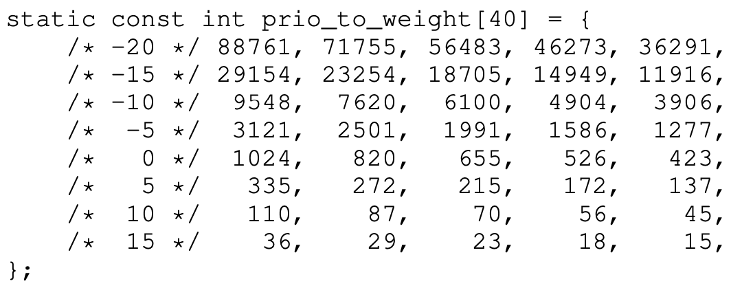 위의 구조체는 우선순위 별 가중치입니다. 이 가중치를 사용해서 프로세스의 time slice를 구할 수 있습니다. 가중치를 사용해서 time slice를 구하는 식은 아래와 같습니다!