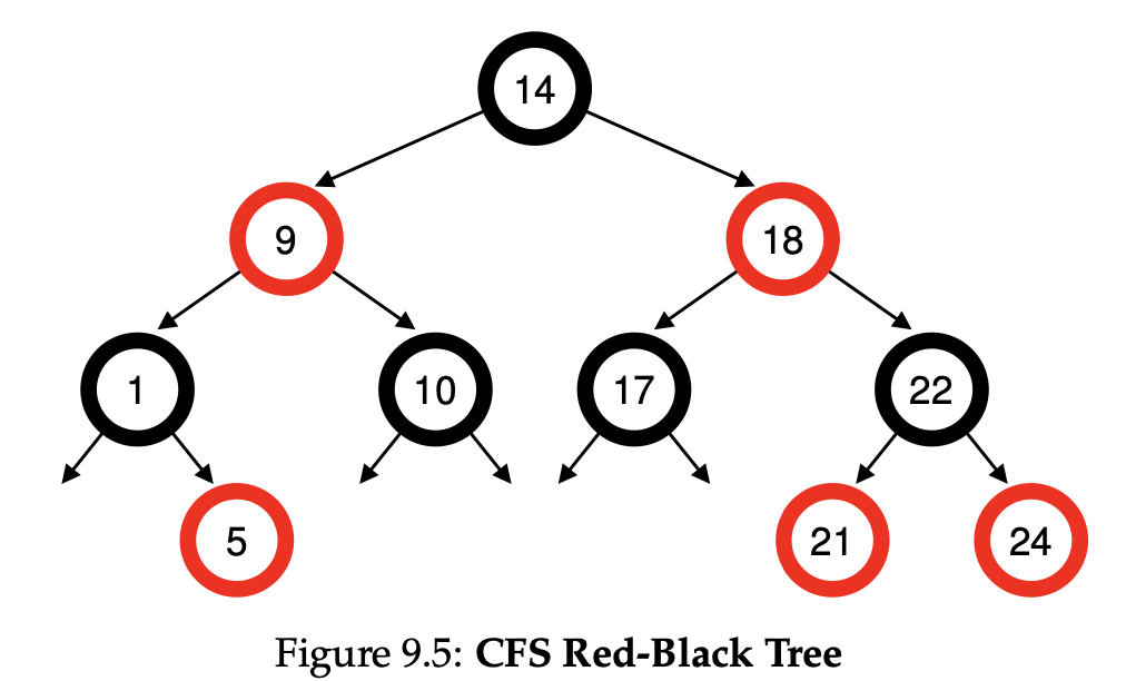 CFS는 효율성에 초점을 둔다고 처음 소개에서 말했습니다. 스케줄러가 좋은 효율성을 갖고 있다는 말은 다음에 실행할 작업을 빨리 찾을 수 있다는 말이 됩니다. 이는 아까 lottery나 stride에서 프로세스들의 종류를 저장하는 단순한 자료구조로는 발전시킬 수 없습니다. 그렇기 때문에 CFS는 red-black Tree라는 자료구조에 프로세스 정보를 저장하여 이러한 부분을 해결합니다. Red-black Tree는 단순한 이진트리와 달리 균형이 잡힌 트리이기 때문에 낮은 깊이를 유지하기 위해 추가 작업을 수행하기 때문에 연산수가 선형이 아님을 보장합니다.
