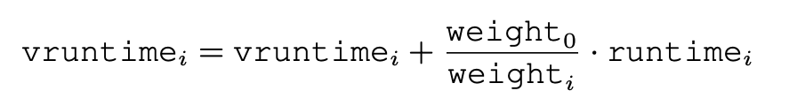 위의 식을 사용하여 아까 A, B의 virtual runtime 비율을 구해보면 1:3이 됩니다. 즉 A의 시간이 마치 3배 느리게 가는 거처럼 만드는 것입니다.
