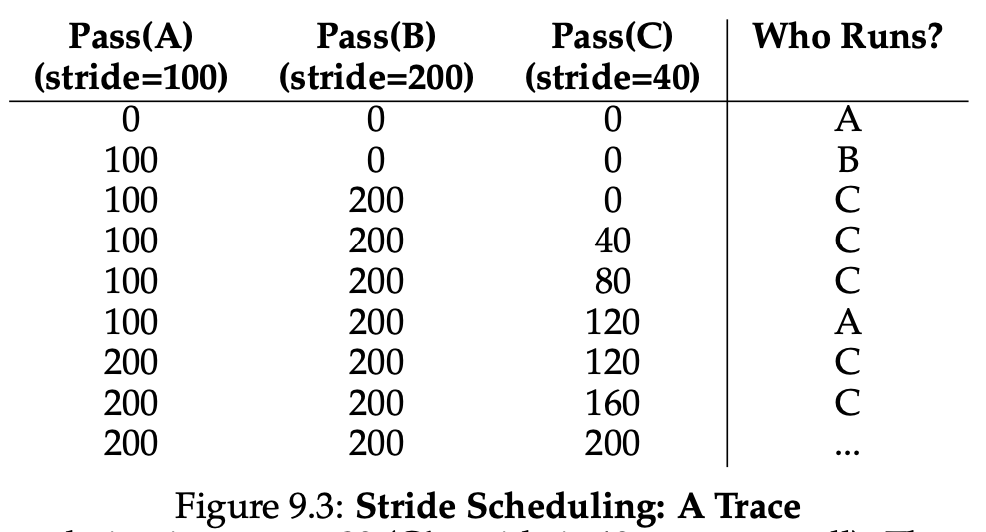 아까도 언급한 대로 lottery 스케줄러는 간단하게 구현이 가능하지만 늘 공평하게 프로세스들을 스케줄링할 수는 없습니다. 따라서 언제나 공평한 스케줄러를 만드는 방법을 연구했고 Waldspurger라는 분이 Stride Scheduling을 발명했습니다!