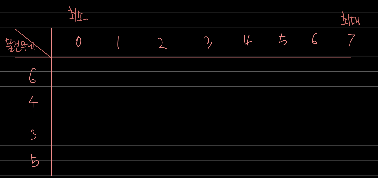 0/1 배낭 문제에서 중요하게 봐야 하는 부분은 배낭에 넣을 수 있는 무게입니다.
