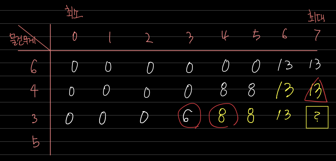 그렇기 때문에 지금 무게가 3,4일 때 위치에 있는 값을 더한 값과 현재까지 7일 때 최댓값을 비교해줘야 합니다.