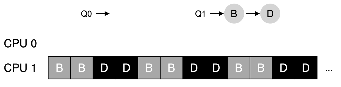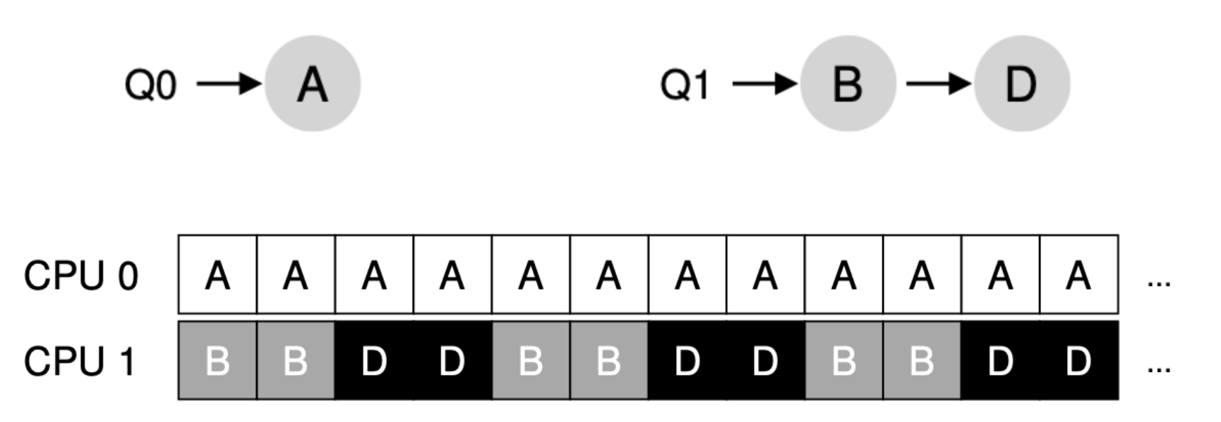 이젠 라인 잘 탄 A마저 완료되어 Q0에는 작업이 더 이상 없습니다. CPU0가 놀고 있네요. 이제는 B, D 프로세스가 화를 내는 것이 아닌 사용자도 화를 냅니다. 아니 왜 저 CPU는 쉬는거지?라면서요. 이러한 문제를 load imbalance(부하 불균형)이라고 합니다. 어떻게 하면 이런 문제를 해결할 수 있을까요?