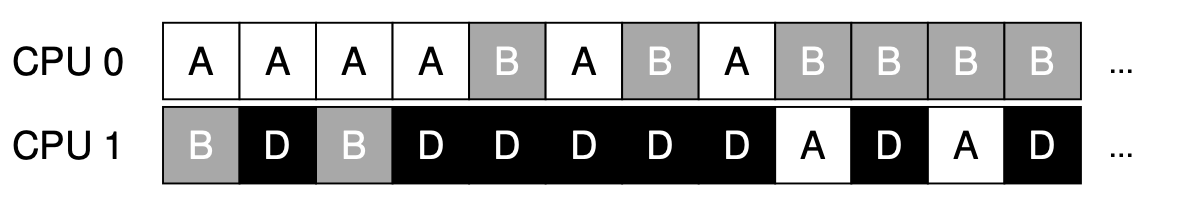 마지막 문제는 Cache Affinity(캐시 선호도)입니다. 특정 CPU에서 프로그램을 수행하면 해당 프로그램은 해당 CPU의 캐시에 여러 가지 데이터를 저장합니다. 다음에 다시 수행될 때 캐시에 저장된 정보를 가지고 더 빠르게 수행할 수 있죠. 하지만 만약 CPU가 여러 개라서 다음에 수행될 때 다른 CPU에서 수행된다면 어떻게 될까요? 또다시 필요한 데이터를 가지고 와야 하는 문제가 발생합니다. 즉 성능이 나빠지는 것이죠. 따라서 멀티 프로세서에서의 스케줄러는 프로그램을 스케줄링할 때 캐시 선호도를 고려해서 프로그램을 동일한 CPU에서 계속 실행되도록 해줘야 합니다.