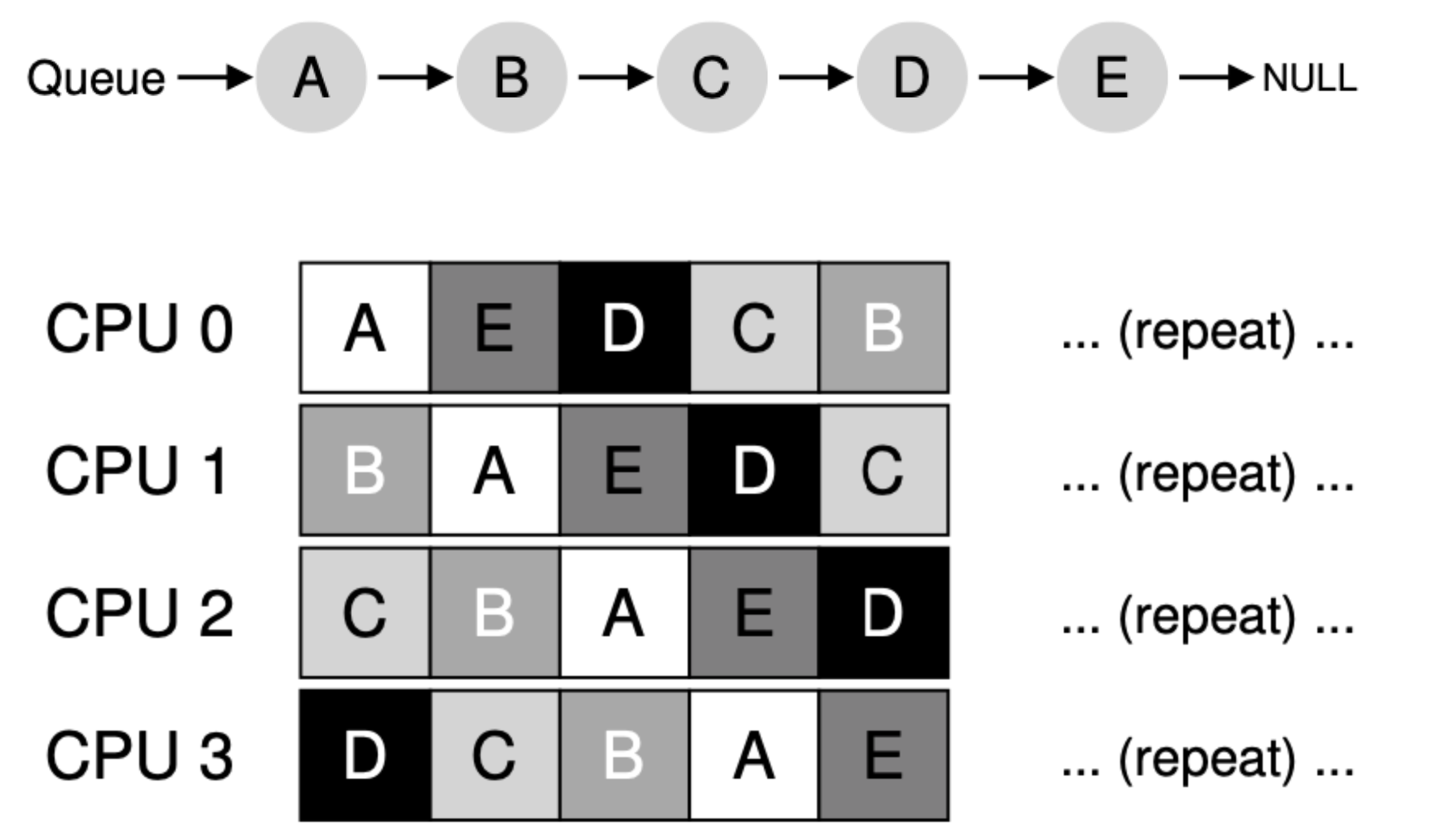 그럼 이제 지금까지 알아본 문제와 배경지식을 바탕으로 멀티 프로세서에서 스케줄링을 사용하는 방법에 대해 알아보겠습니다! 가장 쉬운 방법으로 이전의 글들에서 살펴본 스케줄링 방법들을 그대로 사용하는 것입니다. 즉 싱글 프로세서에서 쓰던 스케줄러를 그대로 사용하는 것이죠. 하나의 큐에 작업들을 넣어서 처리하는 이러한 방법을 SQMS(Single Queue Multprocessor Scheduling)이라고 합니다. 이 방법은 단순하다는 장점이 있습니다.