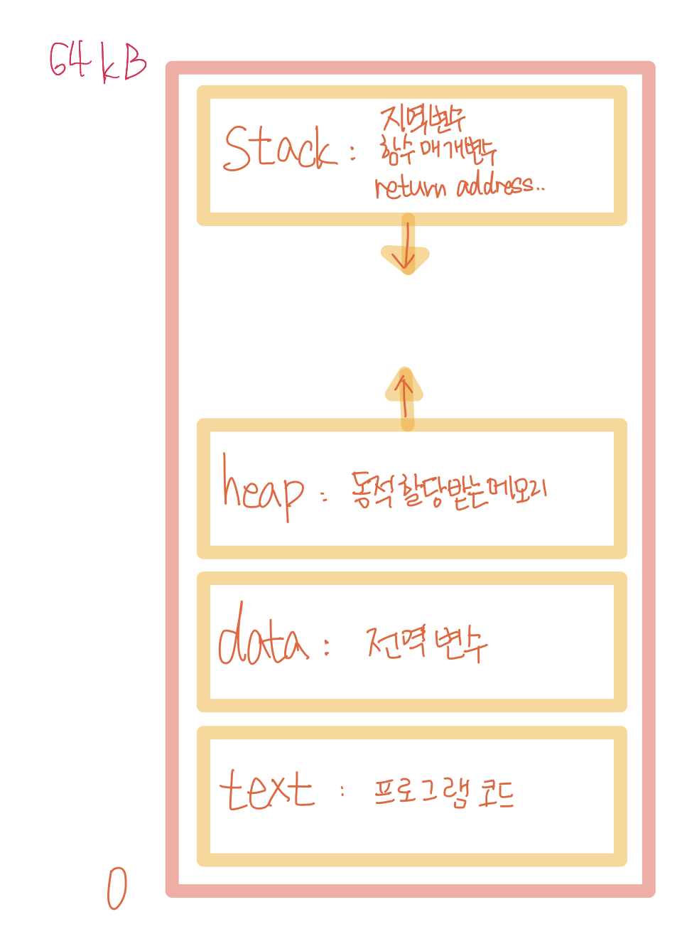 좀 더 자세히 살펴보면 함수를 호출하여 사용할 때 위치를 추적할 수 있도록 하는 return address라는 것을 Stack 공간에서 사용합니다. 또한 지역변수, 매개 변수도 Stack에 저장합니다. Heap에서는 malloc()를 사용한 동적 할당된 데이터가 저장됩니다. 위의 그림에서는 한 프로세스에게 제공한 메모리의 크기가 64KB인가 봅니다. 프로그램의 코드는 0KB에서 시작합니다. 코드가 끝나면 전역 변수들을 위한 메모리 공간이 있고 그다음은 Heap을 위한 공간이 있습니다. 그리고 맨 위에는 Stack이 존재합니다. Text, Data와는 다르게 Stack, Heap은 크기가 변할 수 있기 때문에 위의 그림과 같이 빈 공간을 사이에 두고 서로 커집니다. 물론 위의 그림과 같은 구조는 여러 구조중 가장 일반적인 것이고 다르게 배치할 수 도 있습니다.