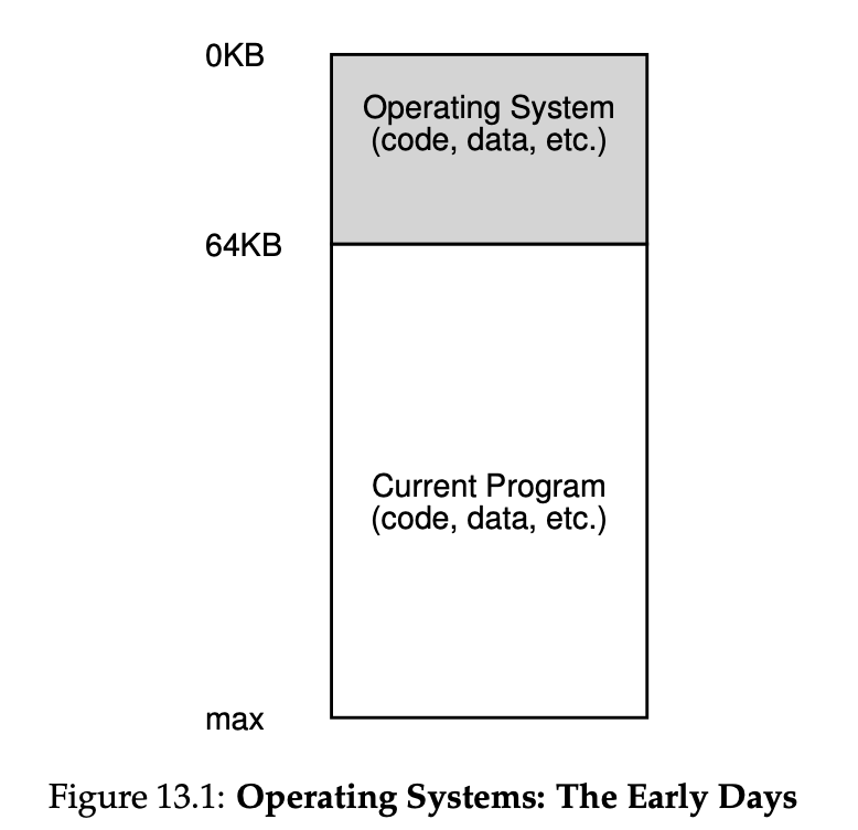 이게 초기 컴퓨터의 메모리 구성입니다. 위와 같이 OS와 현재 사용 중인 프로그램의 데이터가 올라가 있을 뿐 다른 복잡한 건 보이지 않습니다. OS는 메모리의 시작 주소부터 메모리를 사용하고 있으며 OS가 사용 중인 메모리 다음에는 바로 현재 실행 중인 프로그램이 메모리를 사용 중입니다. 이때 프로세스의 수는 하나입니다. 즉 위의 메모리 상태는 OS와 프로세스 하나만 실행 중인 것입니다. 즉 프로그램을 동시에 하나만 실행했기 때문에 이렇게 메모리를 단순하게 사용하더라도 문제가 없었습니다. 하지만 저희가 CPU 가상화 단원에서도 알아봤듯 요즘 컴퓨터는 여러 개의 프로그램을 동시에 실행하기 때문에 위의 방법은 발전이 필요합니다.