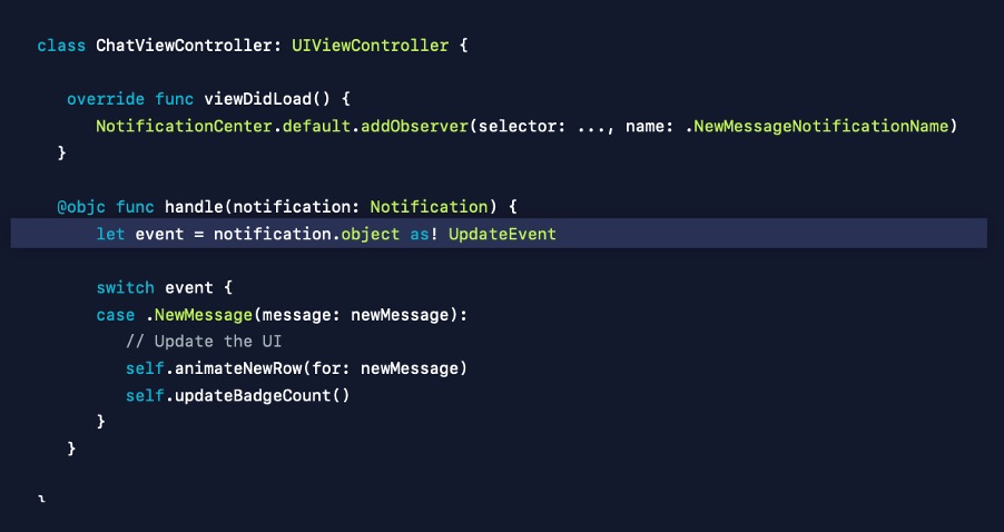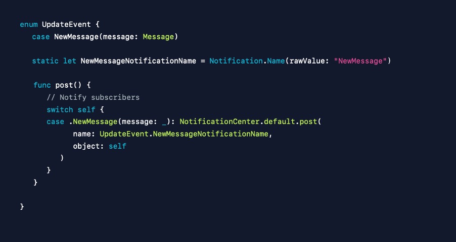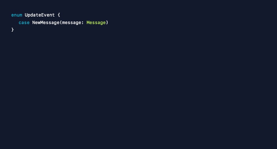 따라서 Swift enum associated 값으로 새로운 타입을 만듭니다. 이는 모델 컨트롤러가 새로운 메시지를 수신할 때 생성할 객체이며 이를 연결된 뷰 컨트롤러 또는 scene으로 보낼 거예요.
