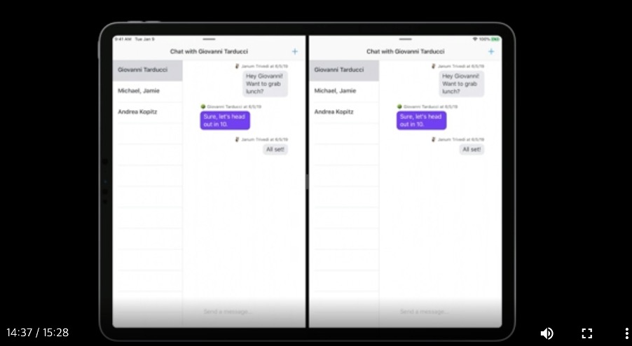 이제 새로운 채팅앱을 사용한다고 가정할 것이고 이 앱은 iOS 13의 multiple window를 지원한다고 보겠습니다. 방금까지 Giovanni와 채팅했는데 서로 다른 두 개의 뷰 컨트롤러와 다른 scene에서 동일한 대화를 보고 있는 것을 알 수 있죠? 만약 이 상태에서 왼쪽 창에서 Giovanni에게 메시지를 보내면..