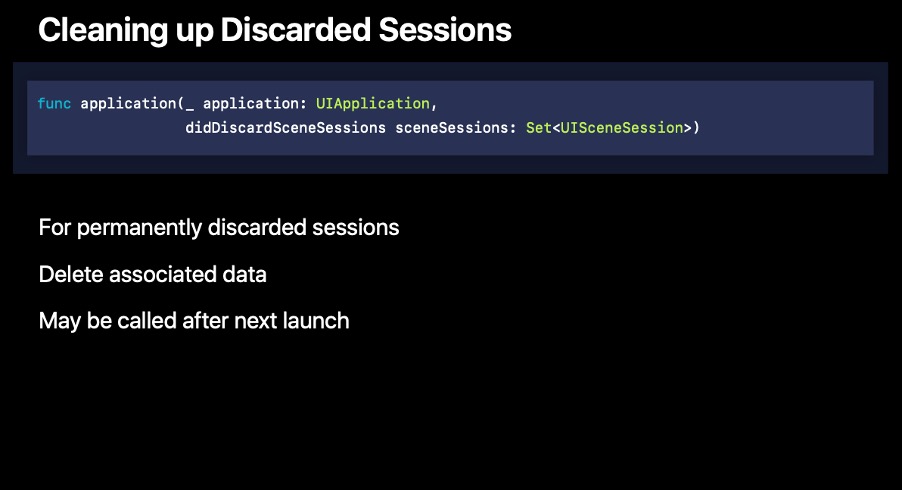 didDiscardSceneSession이 호출되면 어떤 일이 발생할까요. 예를 들어 문서 편집 앱을 사용하다가 직접 앱을 해제했다고 한다면 저장되지 않은 문서나 상태를 위임할 기회를 준다고 합니다. 따라서 사용자가 앱이 실행되지 않는 동안 UIScene을 직접 해제할 수 있게 된다고 하네요. 프로세스가 동작하지 않는 다면 시스템은 폐기된 session을 추적하고 다음에 다시 실행할 때 이를 호출한다고 합니다.