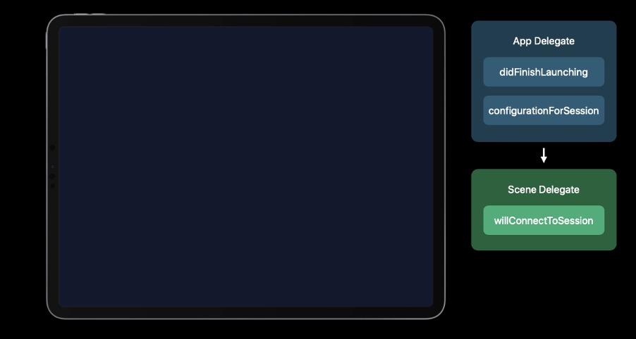 근데 iOS 13부터는 앱들이 하나의 공유 프로세스를 사용하지만 여러 개의 UI, scene session을 가질 수 있기 때문에 App Delegate의 역할을 조금 바꿀 필요가 있습니다. 즉 App Delegate는 실행 이벤트와 같은 LifeCycle에는 책임이 있지만 더 이상 UI LifeCycle에는 책임이 없다는 것이죠.