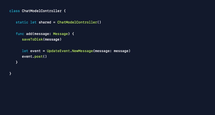 위의 코드는 이를 반영하지 않은 코드, 즉 2개의 UI가 있더라도 하나의 뷰 컨트롤러만 수정되던 상황의 코드입니다. 위에 있는 didEnterMessage 메서드는 메시지를 보낼 때 보내기 버튼을 누르면 호출되는 메서드입니다. 메시지 모델 객체를 만들고 뷰 컨트롤러는 자신의 뷰를 업데이트하고, 그리고 모델 컨트롤러에게 이를 반영하라고 알릴 거예요. 하지만 이렇게 하면 아까도 봤듯 하나만 업데이트되는 문제가 발생했었죠. 따라서 뷰가 스스로 업데이트하는 코드를 지워버리겠습니다.