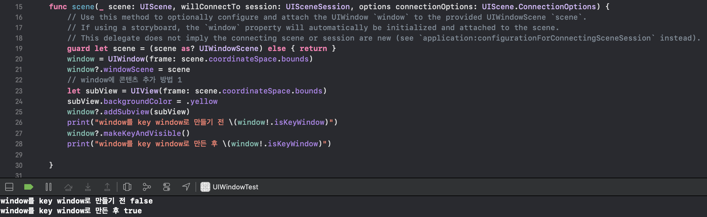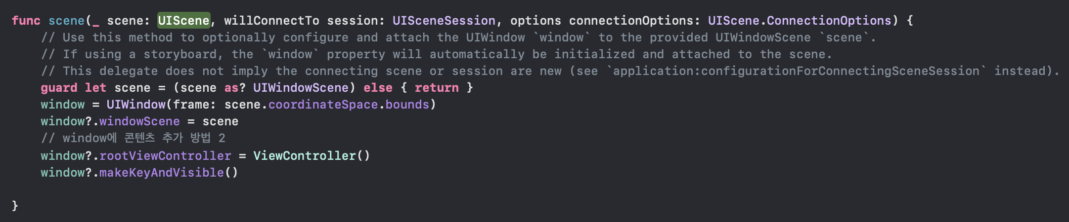 기본적으로 Xcode에서 프로젝트를 템플릿으로 생성하면 Scene delegate에서 window를 생성하여 제공합니다. 만약 스토리보드를 사용하지 않는 다면 window 직접 만들어야 합니다. 아까 본 코드에서 처럼 말이죠!