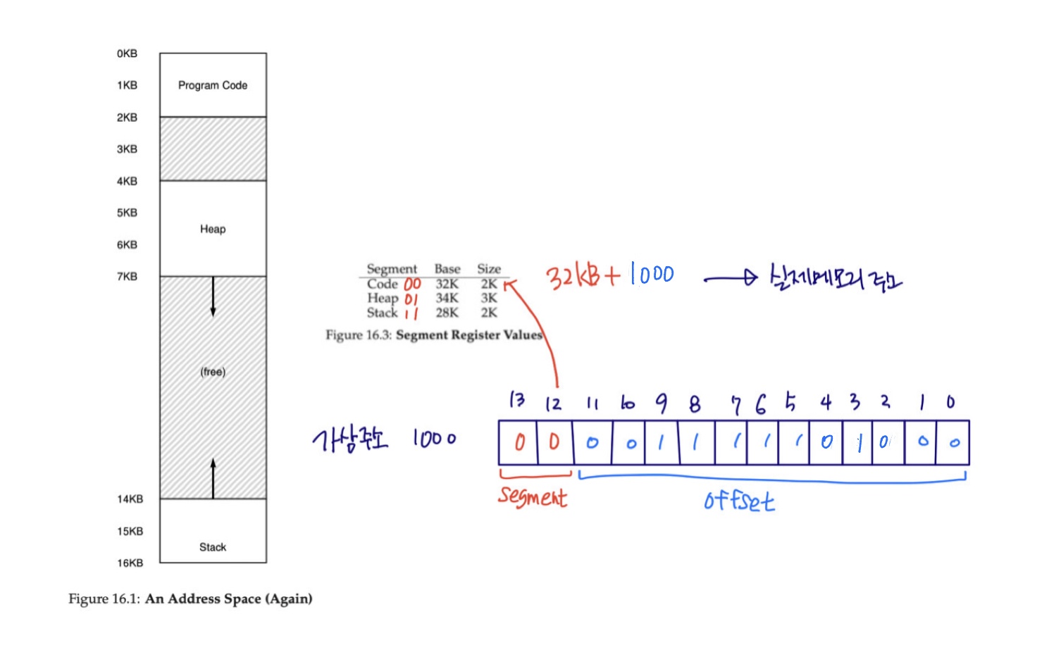 위의 예에서 가상 메모리의 크기는 16KB입니다. 즉 14비트로 표현할 수 있습니다. 그리고 segment는 총 3개입니다. Code는 00, Heap은 01, Stack은 11로 구별할 수 있습니다. 이를 위해 상위 2개 비트로는 segment를 구분하고 하위 12개의 비트로 offset을 계산할 수 있습니다. 실제로 위의 그림에서 가상 주소 1000을 변환했고 동일한 결과가 나오는 것을 볼 수 있습니다.