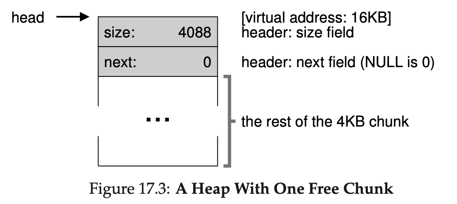 4KB짜리 heap이 있으며 가상 메모리의 주소가 16KB부터 시작한다고 가정해보겠습니다. 이는 처음에는 여유 공간이기 때문에 리스트에 추가해줘야 합니다. 리스트의 처음에는 4KB(헤더 크기 제외)라는 정보가 하나 있어야겠죠? 그럼 이제 이렇게 heap을 초기화하고 heap에 여유 공간 리스트의 첫 번째 요소를 넣는 코드를 살펴보겠습니다. system call인 mmap()에 의해 heap이 할당되었다고 가정하겠습니다.