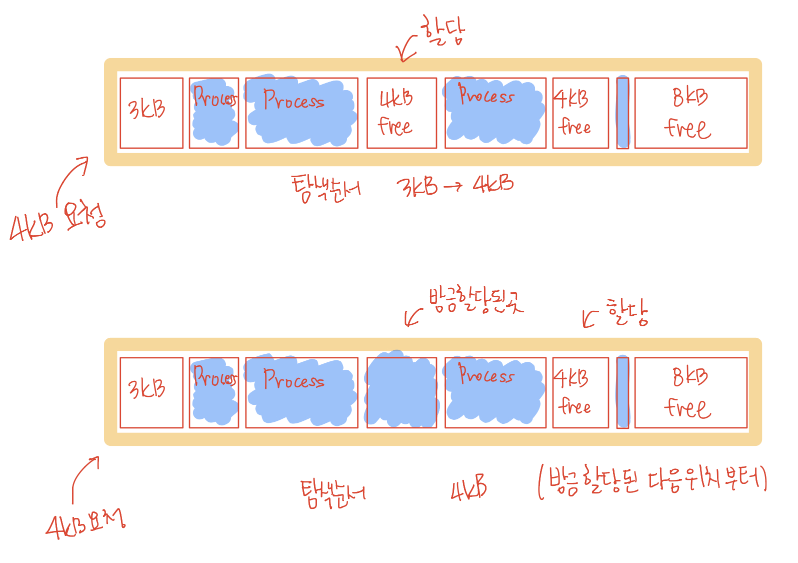 위와 같이 메모리가 존재하고 파란 부분은 사용 중인 부분이라고 생각해보겠습니다. 첫 번째 그림에서 4KB의 요청이 들어오면 먼저 메모리의 앞 쪽부터 탐색합니다. 3KB는 작으므로 넘어가고 그다음 공간인 4KB에 메모리를 할당합니다. 그런 뒤 다음 요청이 들어오면 다시 3KB부터 찾는 것(이건 first fit입니다.)이 아닌 그다음 위치인 또 다른 4KB 위치를 탐색하는 것이 next fit입니다.