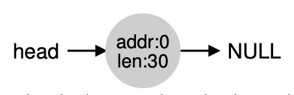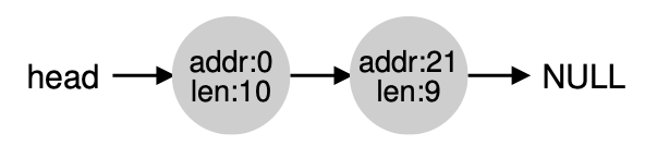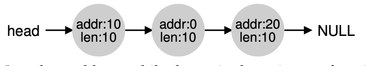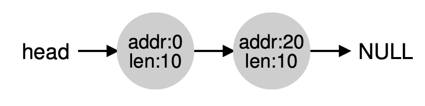 위의 그림은 30바이트 크기의 Heap입니다. 위의 heap에는 여유 공간이 2개 있습니다. 0~10, 20~30이 여유 공간입니다. 아까 세운 가정 때문에 10바이트 보다 큰 요청은 할 수 없습니다. 잠깐 그림으로 보면 아래와 같이 여유공간을 나타내는 리스트가 있습니다.