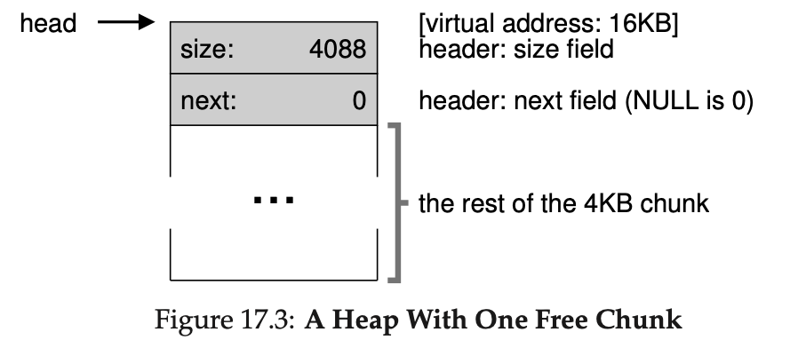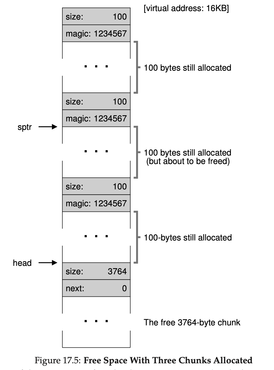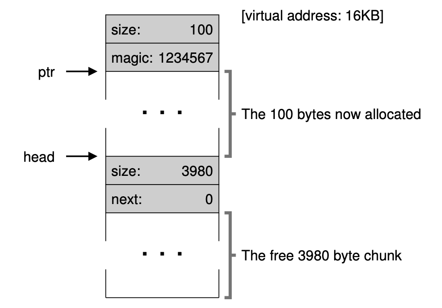 우선 메모리 관리에 대해 알아보기 전에 메모리를 할당해주는 allocator(할당자)에서 사용되는 몇 가지 메커니즘을 살펴보겠습니다. 먼저 대부분의 할당자에서 일반적인 기술인 분할, 병합에 대해서 알아보겠습니다. 그런 뒤 할당된 영역의 크기를 빠르고 쉽게 추적할 수 있는 방법을 알아보겠습니다. 마지막으로 여유 공간 안에 간단한 리스트를 만들어서 어디가 여유 공간인지 추적하는 방법에 대해 알아보겠습니다!