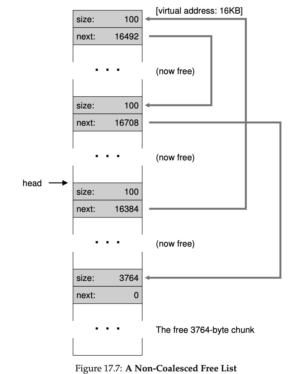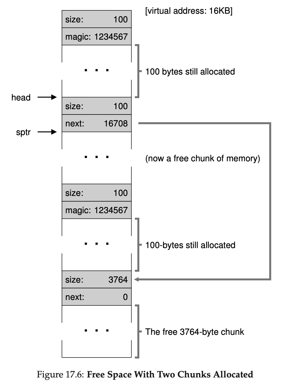 100바이트 할당을 3번 하면 위의 그림과 같이 구성됩니다. 그럼 만약 일부를 free()하면 어떻게 될까요? 그럼 지금 sptr 포인터를 반환하는 과정을 살펴보겠습니다. 이는 가상 메모리 16500에 해당하는 부분으로 사실 free(16500)이라고 표현될 수도 있습니다. 프로그램은 이를 반환하며 바로 사용 가능 리스트에 추가합니다.