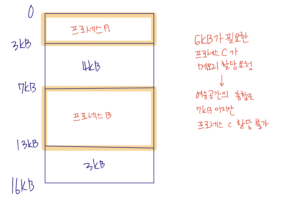 위의 그림과 같이 16KB 크기의 메모리가 존재하고 프로세스 A, B가 메모리를 사용 중이라고 가정하겠습니다. 현재 남은 여유 공간은 7KB죠? 그런데 6KB 크기의 메모리를 필요로 하는 프로세스 C가 실행되고 싶고 공간도 있지만 실행되지 못하는 위와 같은 경우를 외부 단편화라고 합니다.