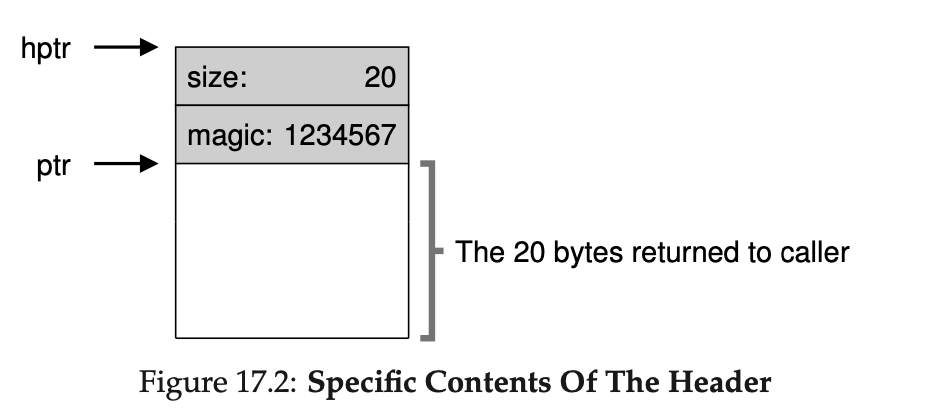 위처럼 header에 size와 함께 매직 넘버라는 정보가 함께 저장되었습니다. 이러한 메모리를 해제하기 위해 free(ptr)을 호출하면 free는 간단한 포인터 연산을 사용하여 헤더의 시작 지점을 찾아냅니다. 그런 뒤 헤더의 크기와 헤더에 저장되어있던 할당된 크기만큼의 메모리를 해제합니다.
