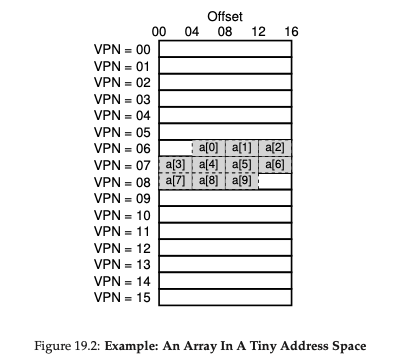 그럼 TLB를 사용한 주소변환 방법이 TLB가 없는 상황에 비해 얼마나 메모리 접근이 적게 발생하는지 예를 보고 이해해보겠습니다. Page의 크기는 16 바이트이며 가상 주소 공간의 크기를 8비트 (2^8 = 256바이트)라고 가정하겠습니다. 이 상황에서 가상 주소 공간에 존재하는 페이지 수는 16개가 되겠죠? 이러한 상황에서 아래 코드를 실행한다고 생각해보겠습니다.