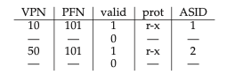 이렇게 프로세스마다 다른 ASID정보를 저장하여 주소 변환을 잘 수행할 수 있도록 합니다. 지금까지는 VPN이 동일한 예를 봤었는데 PFN이 같은 상황, 즉 코드를 공유하고 있는 상황은 어떨까요?