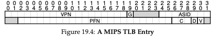 MIPS의 TLB를 살펴보면 프로세스 간에 전역적으로 공유되는 page에 사용되는 G라는 비트가 존재합니다. 이 비트가 설정되면 ASID가 무시되게 됩니다. 또한 아까 context switch에 사용한 ASID도 존재합니다. 만약 한 번에 실행되고 있는 프로세스 수가 256(2^8)개 이상일 경우엔 OS가 어떻게 작동해야 할까요? 그리고 page가 하드웨어에 의해 캐싱되는 방식을 결정하는 3개의 coherence(C) 비트도 존재합니다. 또한 Page가 사용되었을 때 표시하는 D(dirty) 비트, 변환이 유효한지 하드웨어에 알려주는 Valid(V) 비트, page 크기를 여러 개 지원하는 page mask 비트(여기엔 없습니다)도 있습니다. 위의 그림에서 회색으로 나타난 부분은 사용되지 않는 비트입니다.
