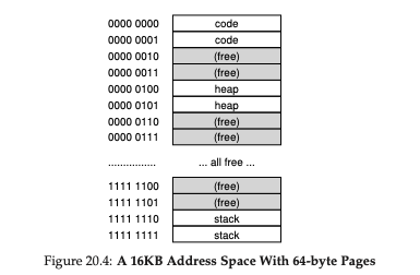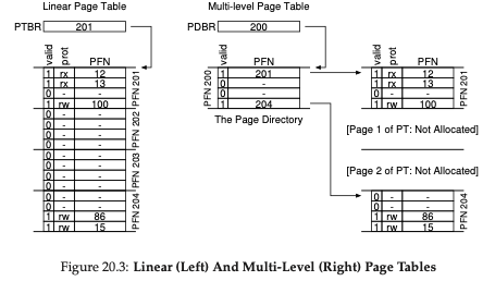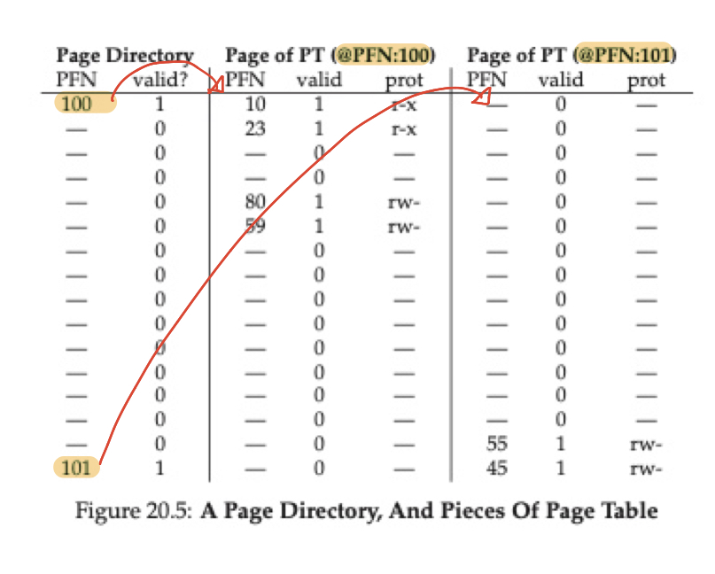 위와 같이 page directory의 각 요소에는 page table들의 첫 항목이 존재합니다. 각각의 page table에는 16개의 entry가 존재합니다. 지금 살펴보고 있는 예에서는 VPN 0,1, 4,5, 254,255에 유효한 page들이 있었습니다. 즉 위와 같이 2개의 page table와 하나의 page directory만 유지하면 메모리 할당을 문제없이 수행할 수 있는 것입니다. 기존의 방법대로라면 16개의 page table을 유지했어야 했으니 엄청나게 메모리를 아낄 수 있겠네요!