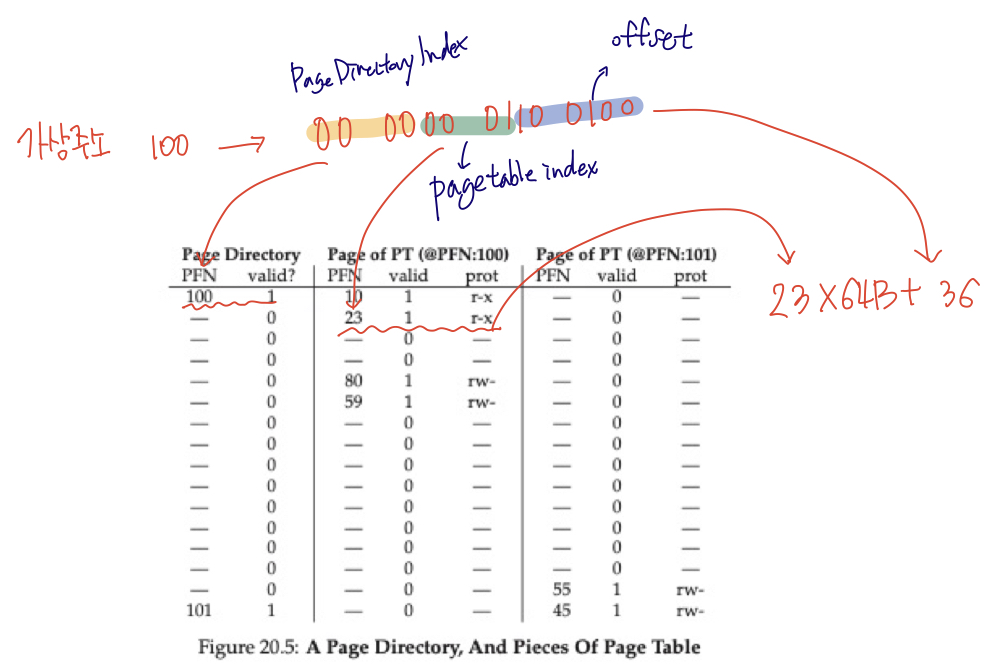 그림이 이해가 되시나요.. 아무래도 Multi level page table 과정이 복잡하다 보니 좀 난잡해 보이네요 ㅠ.. 일단 설명을 하자면, 우선 가상 주소 100을 14비트로 나타내면 0000 0001 100100으로 나타납니다. 아까 알아본 대로 앞에서부터 4비트는 Page directory index(PDI), 그다음 4비트는 page table index(PTI), 그리고 나머지는 offset으로 사용하면 됩니다. PDI는 0이고 PTI는 1이니 page table을 찾아가서 PFN을 보면 23입니다. 따라서 실제 주소는 23*64 + 36이 되는 것이죠!