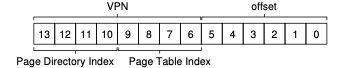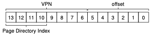 이렇게 14비트의 주소 공간 중 상위 4비트를 page directory index를 나타내기 위해 사용하면 됩니다. 이제는 특정 page table을 가리키게 되었으니 해당 page table의 어떤 page entry정보에 접근해야 하는지를 알아야 합니다. 1개의 page table에는 16개의 page entry가 있었으니 4개의 비트로 표현할 수 있을 것 같네요. 따라서 VPN의 나머지 4비트를 PTE정보로 사용하면 됩니다.