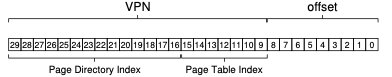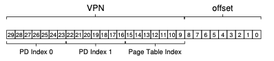 지금까지 알아본 multi level page table은 사실 2 레벨밖에 없었습니다. 그런데 실제로는 이보다 더 많은 레벨로 구현한다고 합니다. 그럼 왜 더 많은 레벨을 구성해야 하는지 살펴보겠습니다. 간단하게 예를 하나 들어보면, page의 크기가 512바이트, PTE의 크기가 4바이트인 30비트 가상 주소 공간이 있다고 생각해보겠습니다. 그럼 VPN으로 21비트, offset으로 9비트를 사용하는 즉 아래와 같은 구조로 가상 주소가 구성됩니다.